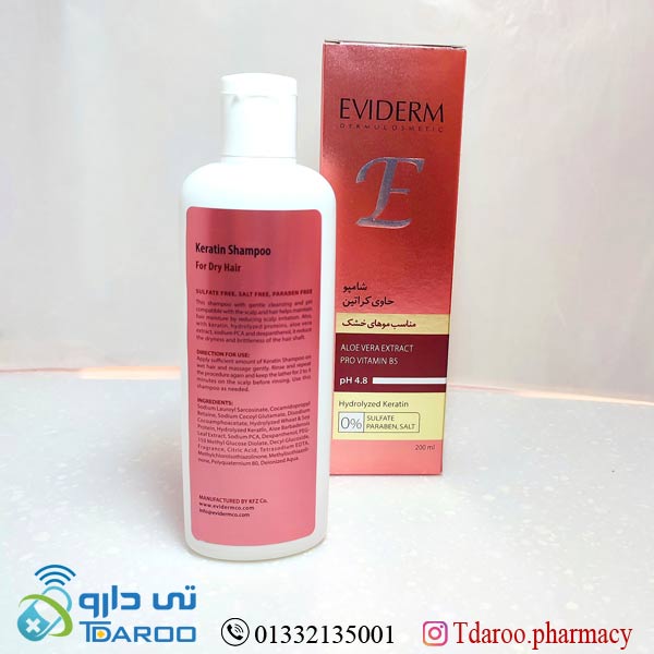 شامپو حاوی كراتین مناسب موهای خشك فاقد سولفات كراتینه موهای خشك اویدرم با شویندگی ملایم و حفظ رطوبت موها و كاهش تحریك پذیری پوست سر می شود.